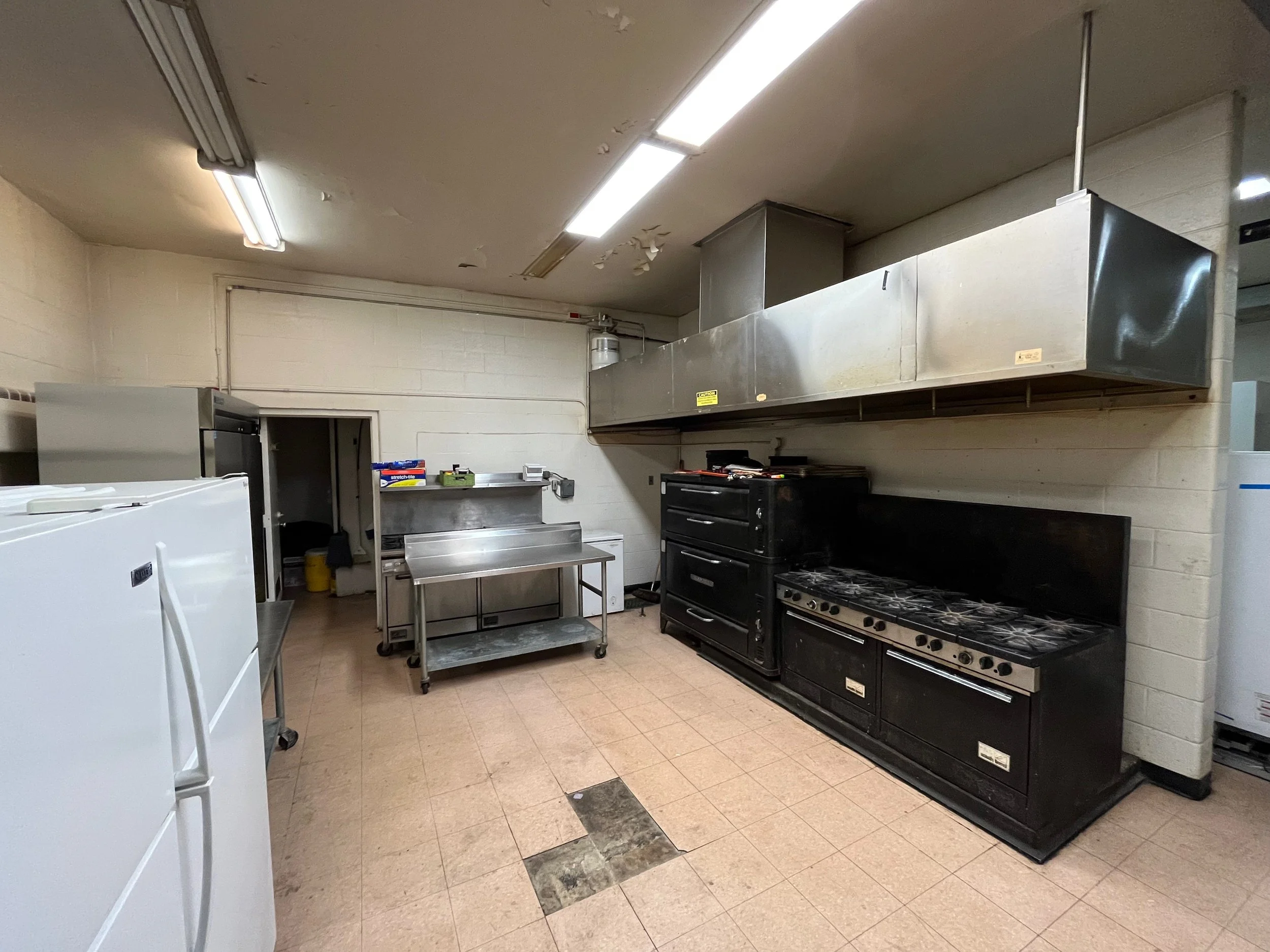 A large commercial kitchen is fully equipped with 2 commercial sinks, refrigerators, 2 stoves with 10 burners.