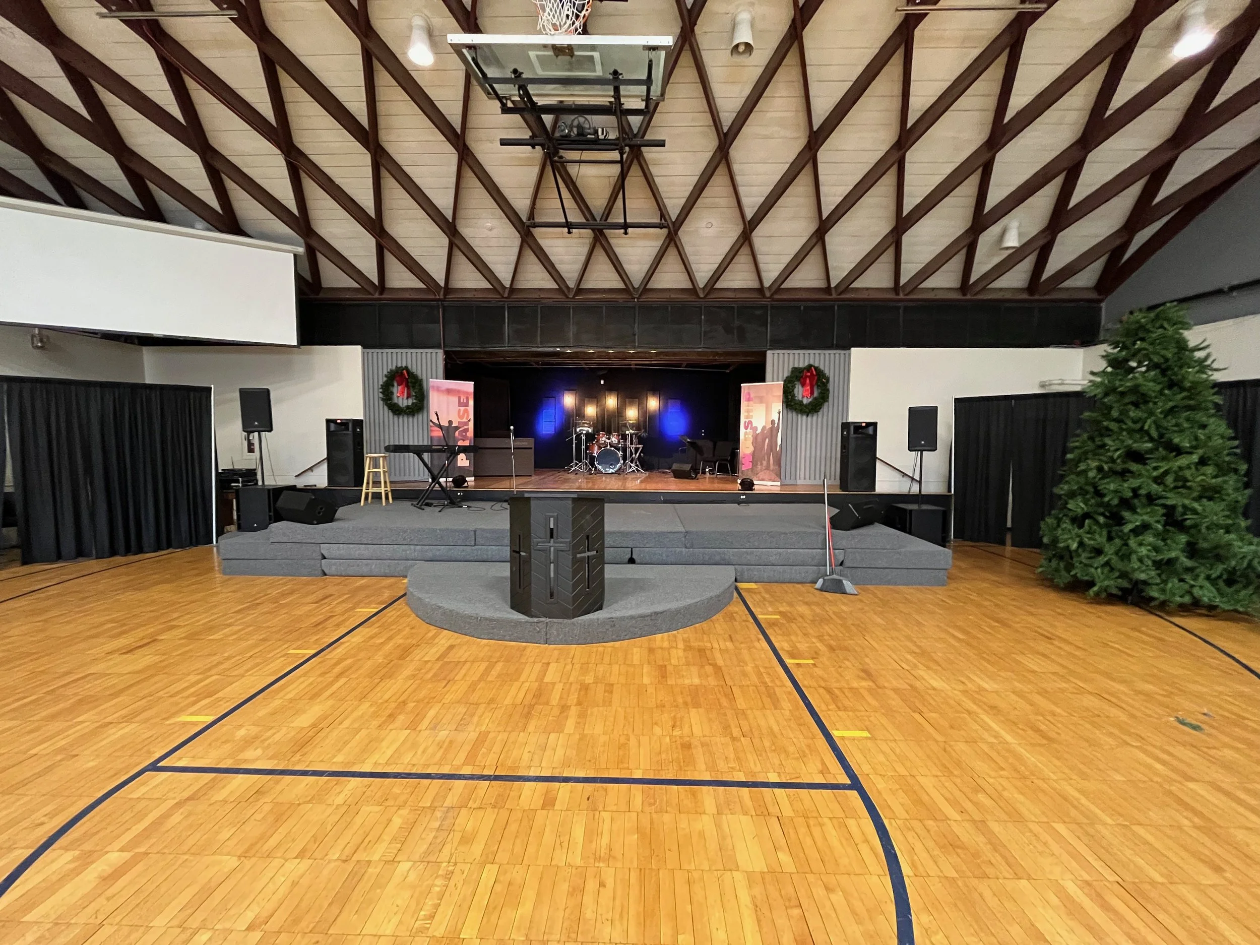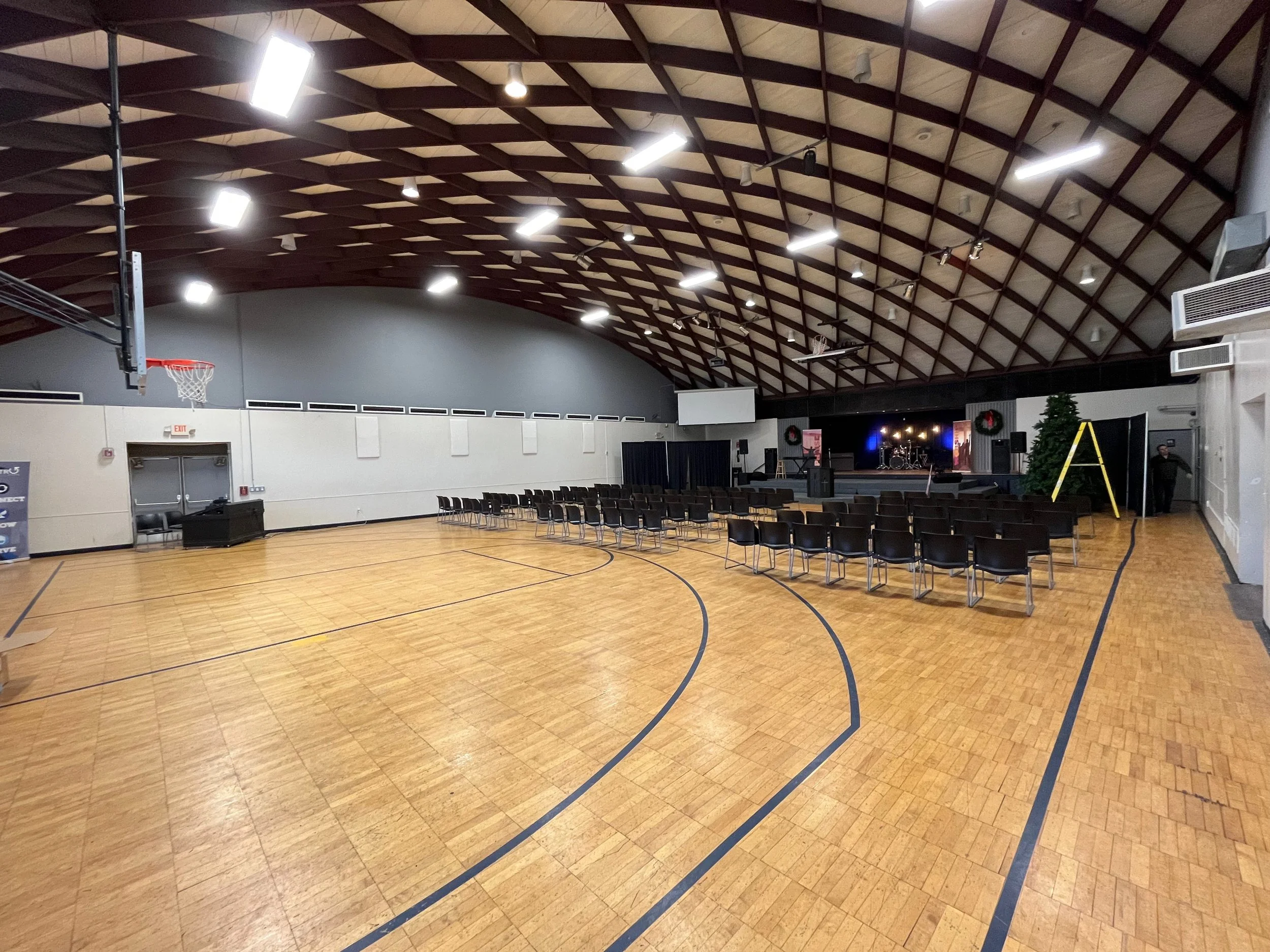 The gym (57 by 77ft) has a well maintained wooden floor with 2 basketball hoops. The raised stage has lighting and sound hookups and the church sets up chairs and the church uses the gym as their sanctuary.