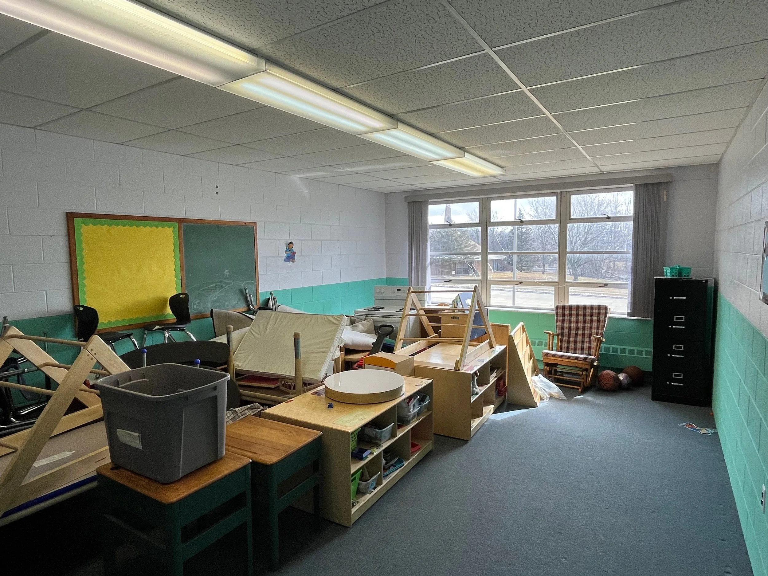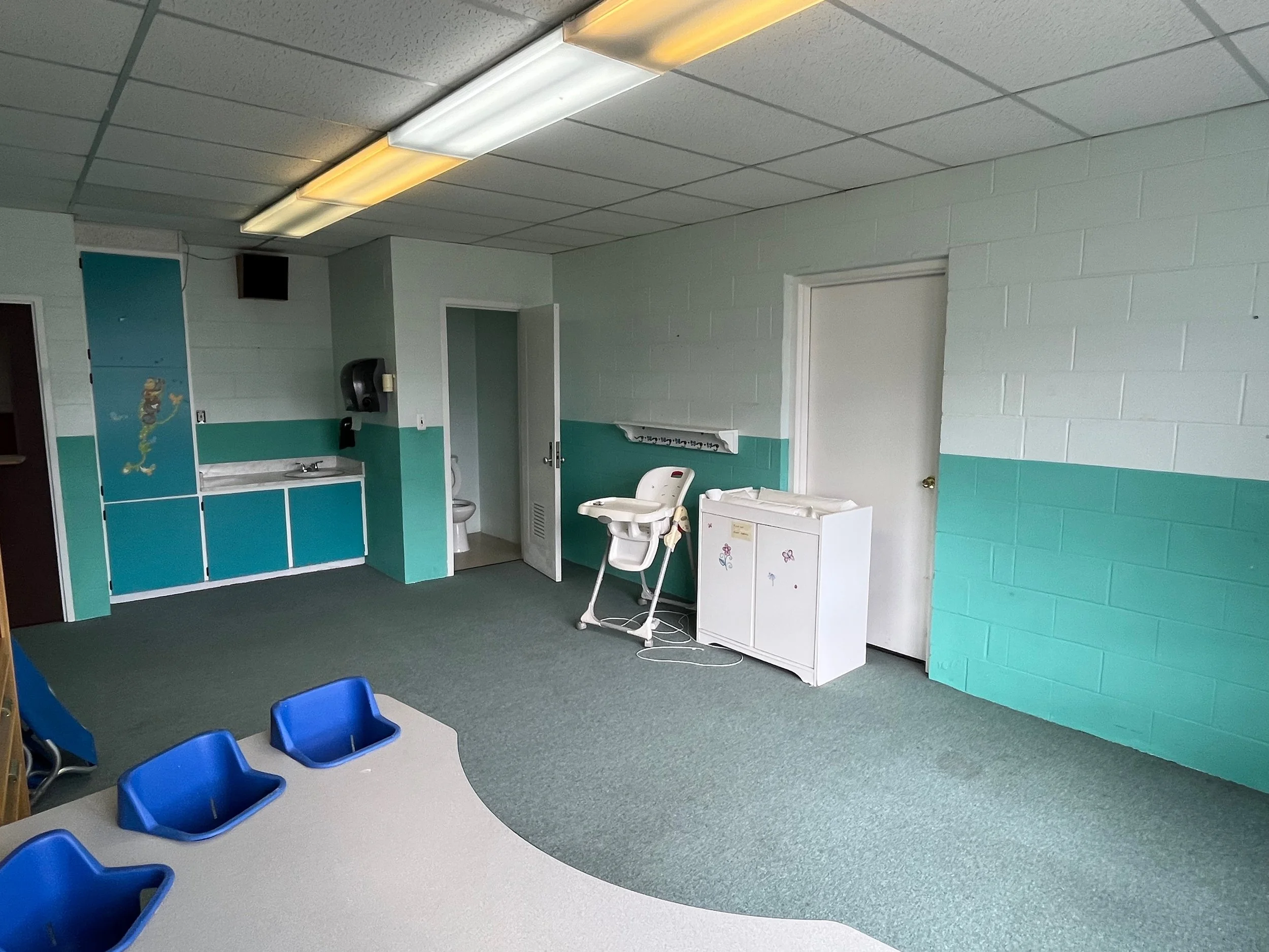 6 classrooms are located in the same wing bordering the staff room and kitchen. Two of the classrooms have attached half baths. There are two entrances: the church’s main entrance and an exit in the classroom hallway.