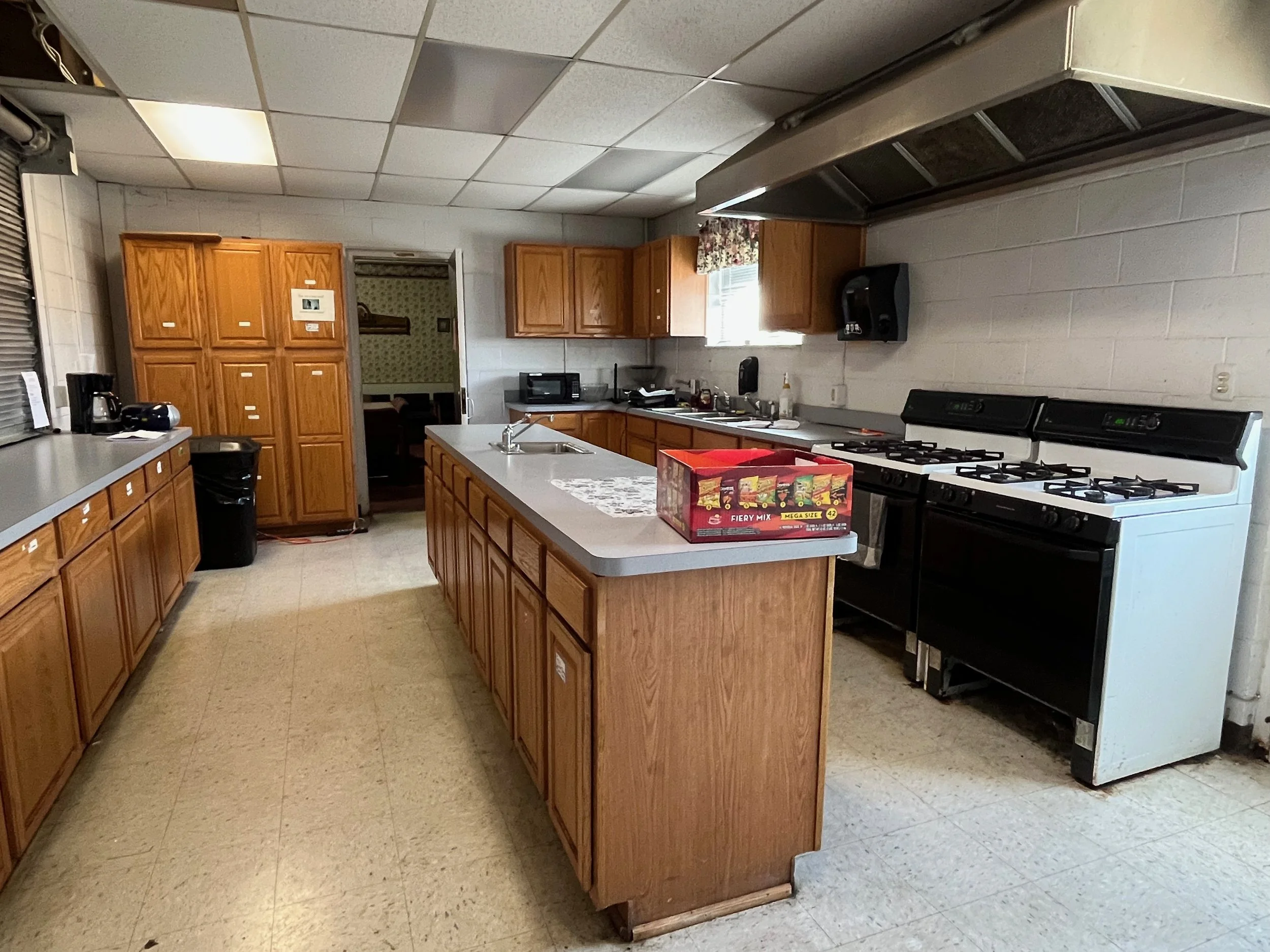 A large kitchen with two hooded stoves, storage space, and sinks is next to the classrooms.